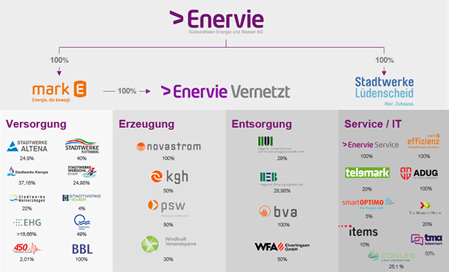 Zur ENERVIE - Südwestfalen Energie und Wasser AG gehören zu 100 Prozent die Tochtergesellschaften Mark-E Aktiengesellschaft, ENERVIE Vernetzt GmbH und Stadtwerke Lüdenscheid GmbH.