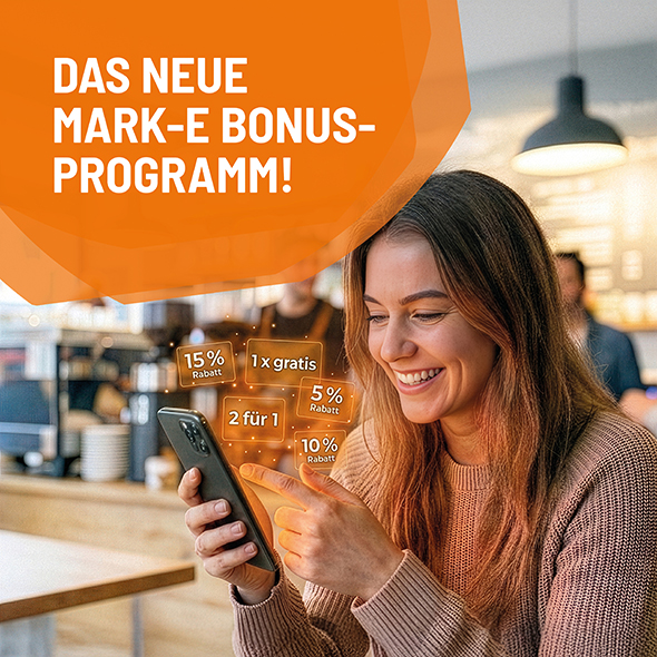 Mark-E bietet seinen Kundinnen und Kunden ab sofort das neue „Mark-E Bonusprogramm“ mit vielen attraktiven Rabatten und Vergünstigungen an. Der Zugang zum Programm erfolgt über die Mark-E App und ist somit jederzeit auf dem Smartphone verfügbar. Die Vorteile des neuen Bonusprogramms kommen dabei sowohl den Kundinnen und Kunden von Mark-E als auch den Partnern in der Region sowie dem regionalen Einzelhandel zugute. Einige der Bonusangebote können auch gleich mehrfach genutzt werden.
